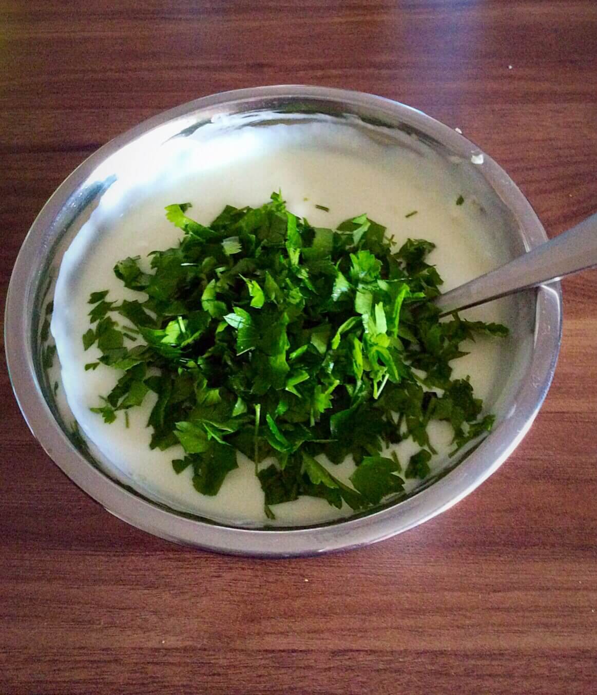 - Приготувати соус. Для цього змішати майонез і сметану (або один із варіантів). Додати часник, пропущений кріз прес і дрібно нарізану зелень. Добре перемішати. За потреби посолити.