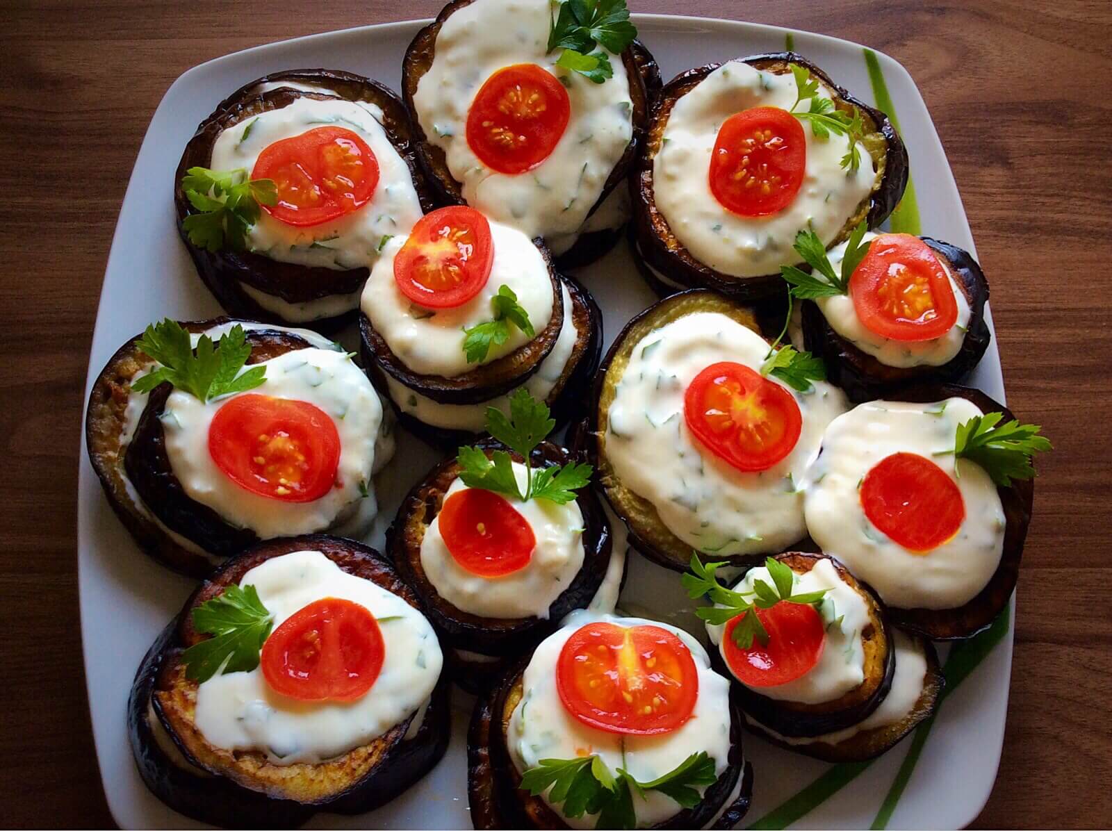 - Викласти кружки баклажанів на тарілку шарами, по 2-3 кружки заввишки, змащуючи кожен шар соусом.Прикрасити зверху помідорами, нарізаними кружками, і свіжою зеленню. Перед подачею дати добре охолодити і дати настоятися.