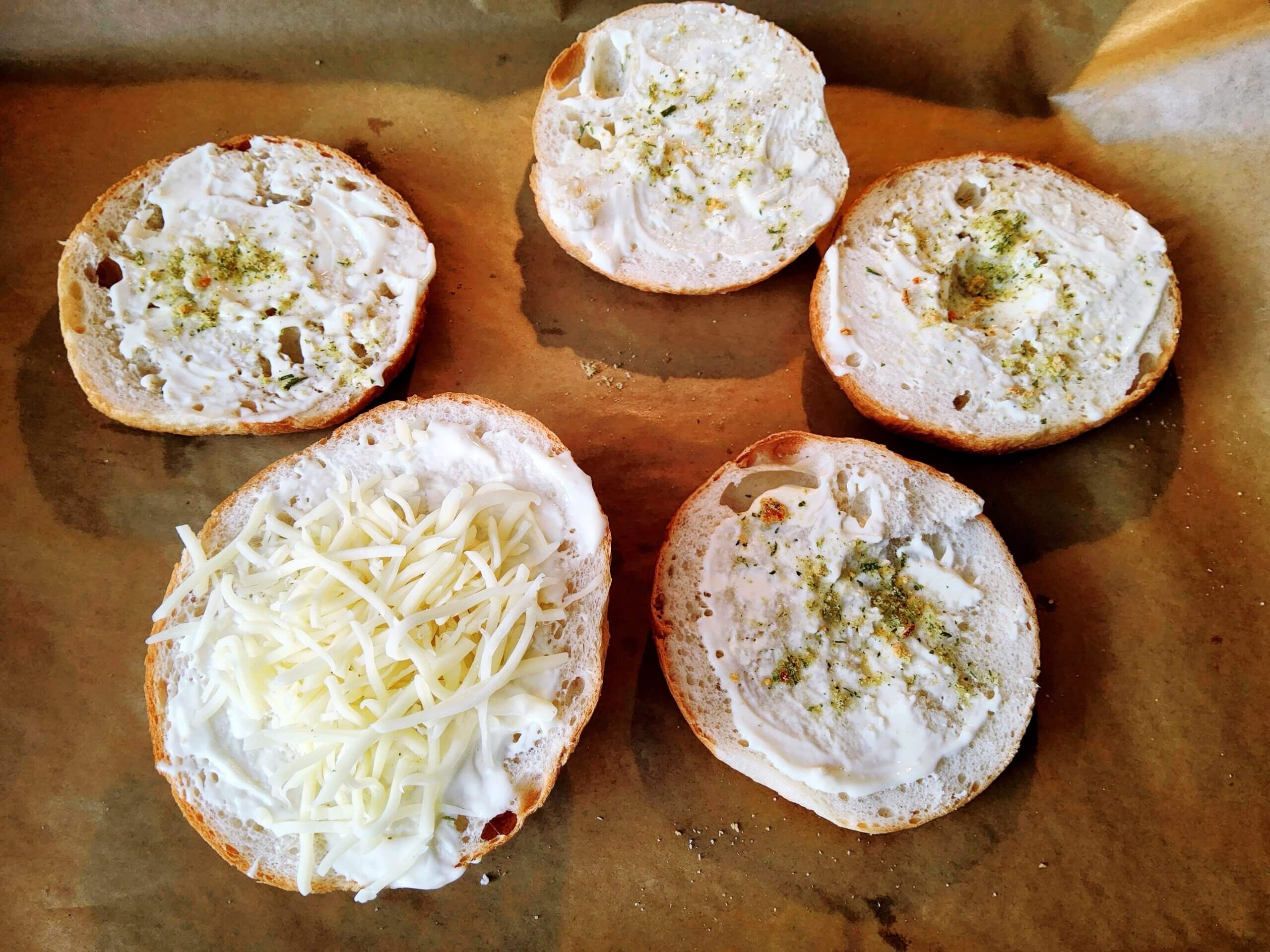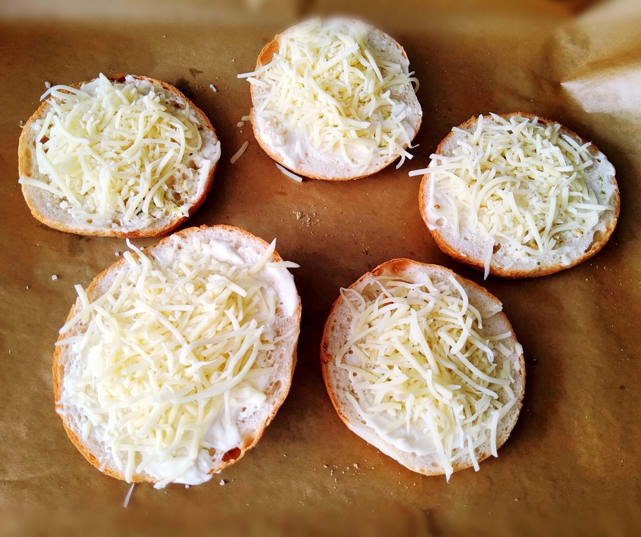 - Зверху посипати тертим сиром. І поставити в попередньо розігріту до 185 °C духовку, приблизно на 7–10 хвилин, поки сир розплавиться, а краї хліба підрумʼяняться.