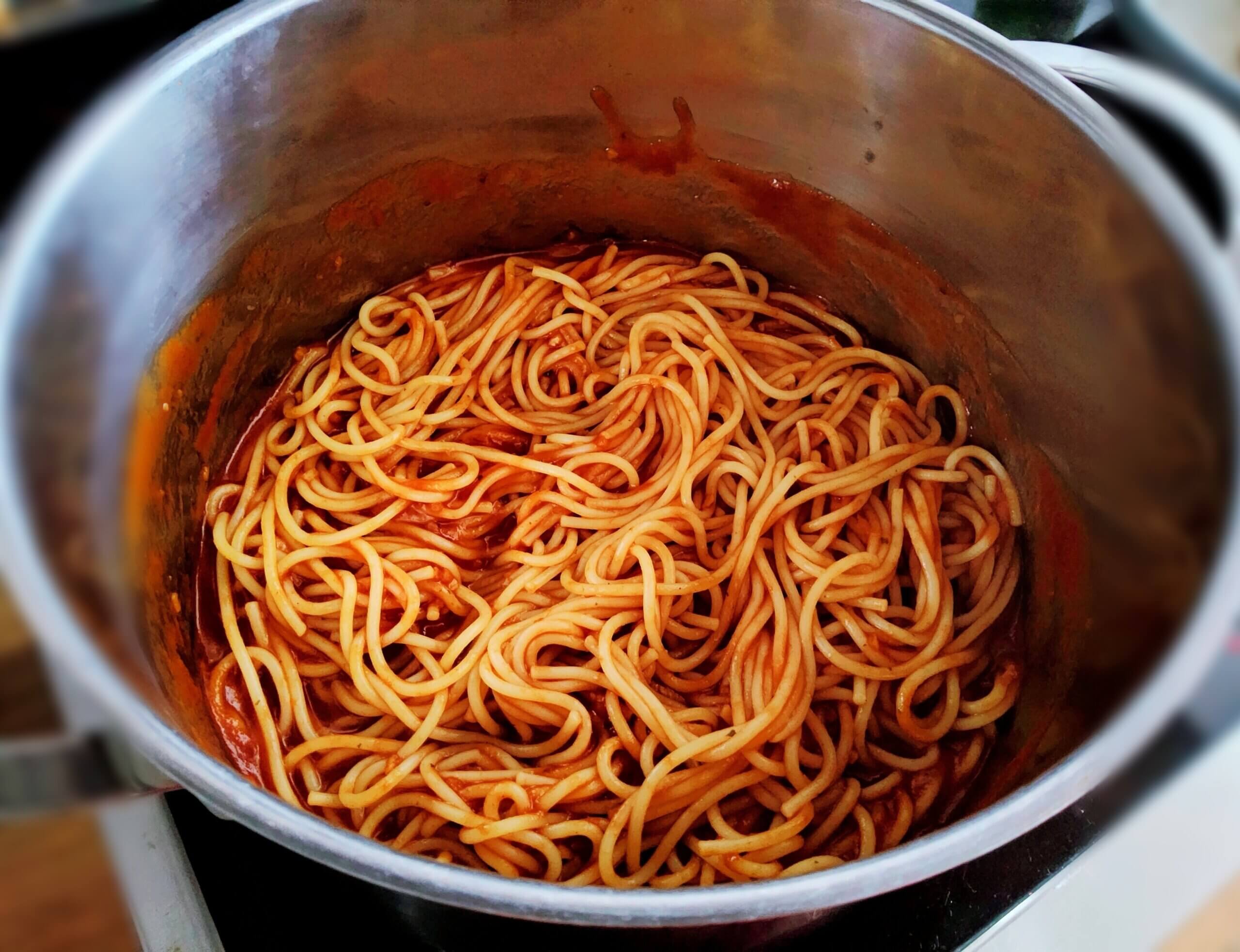 Основа страви — макарони в густому томатному соусі з легкою солодко-кислою ноткою та розплавленим сиром зверху. Смак простий, але збалансований.