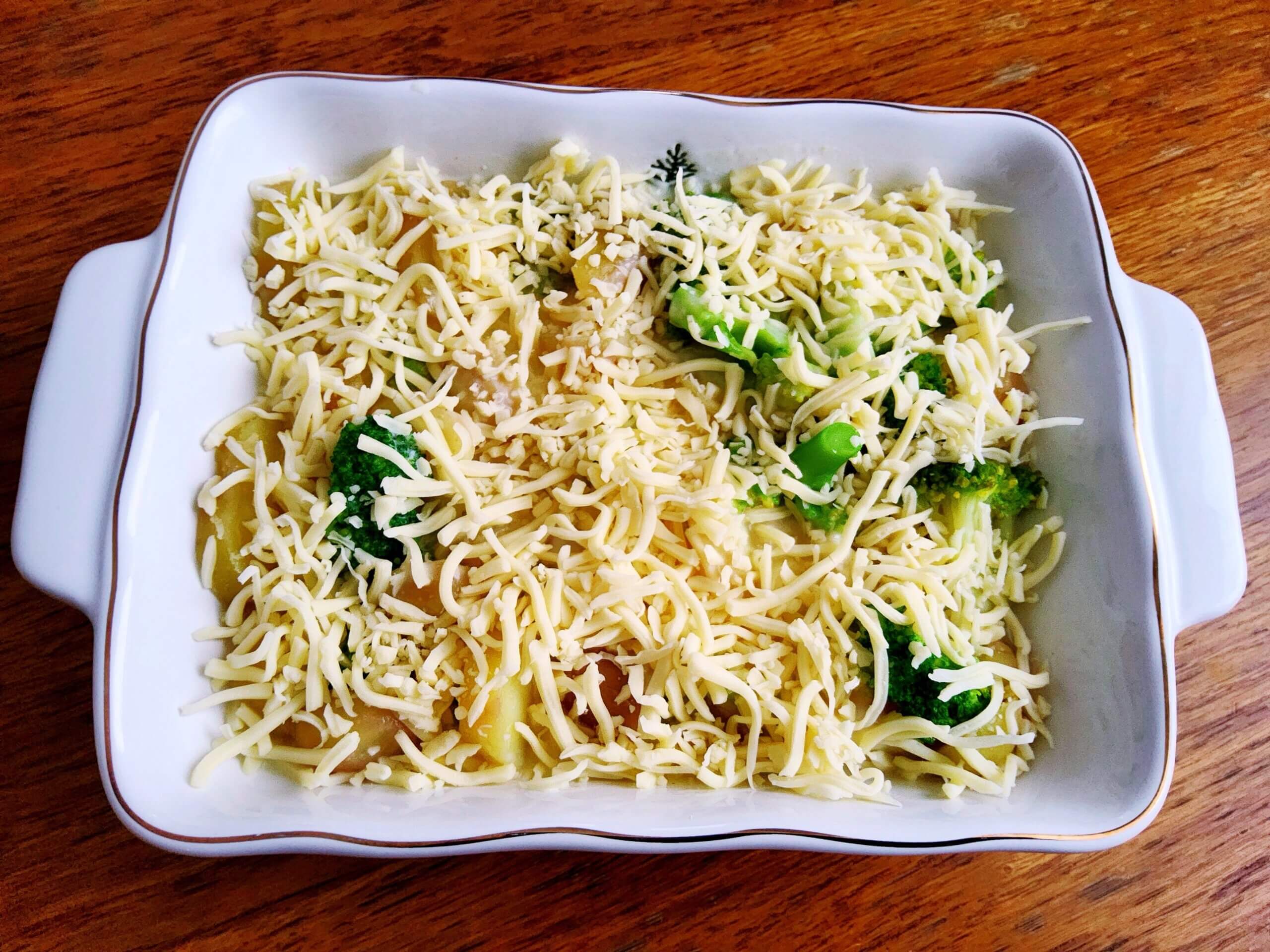 30 хвилин при 185°C до золотистої сирної скоринки. Картопля і броколі готуються заздалегідь (відварити до напівготовності), тому в духовці потрібно тільки прогріти страву і запекти сир.