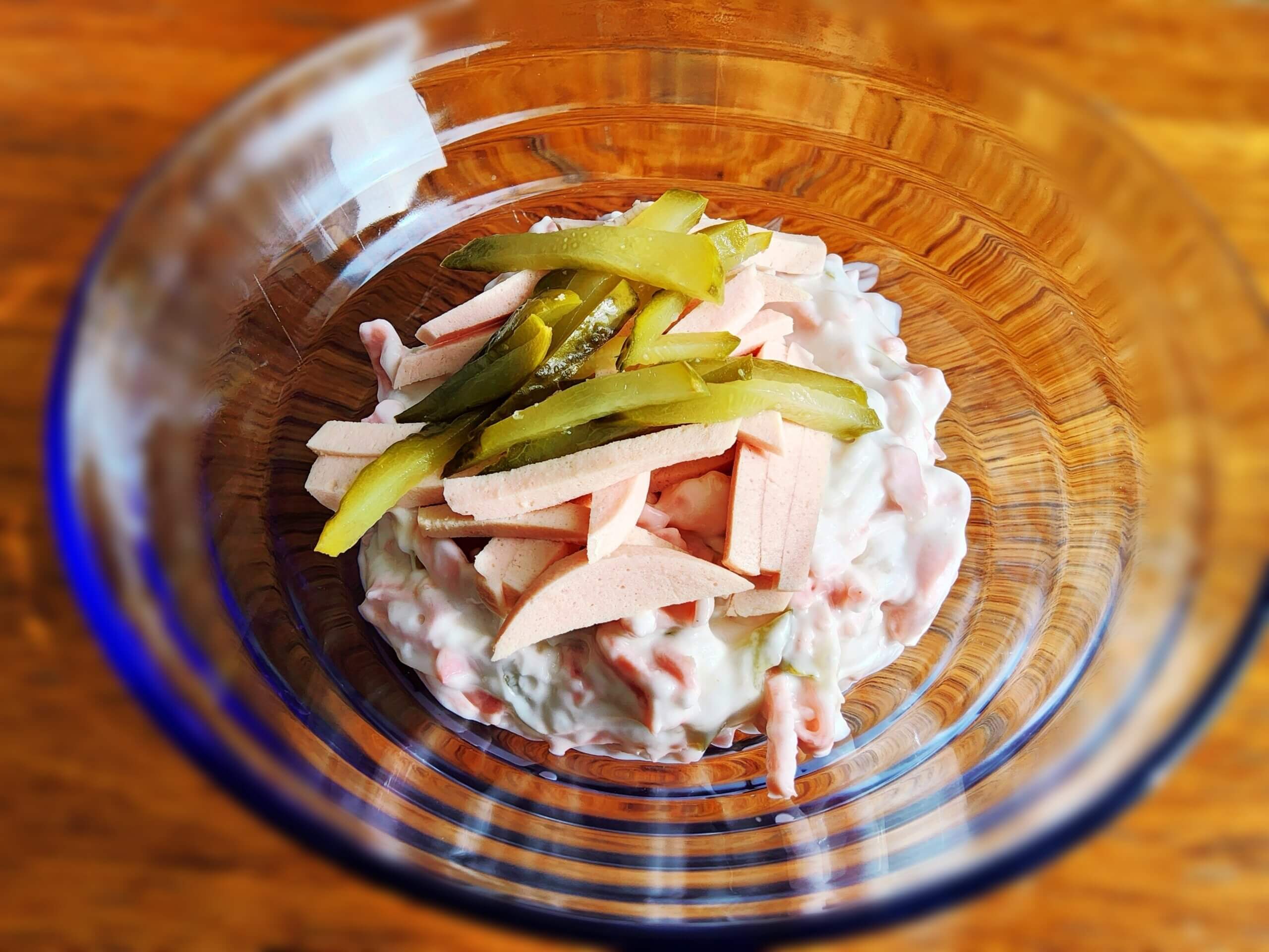 Майонез використовувати класичний 50–67% жирності. Частину майонезу можна замінити сметаною або натуральним йогуртом для легшого смаку. Сіль зазвичай не потрібна — ковбаса і огірки вже містять достатньо солі. Для аромату достатньо дрібки білого меленого перцю.