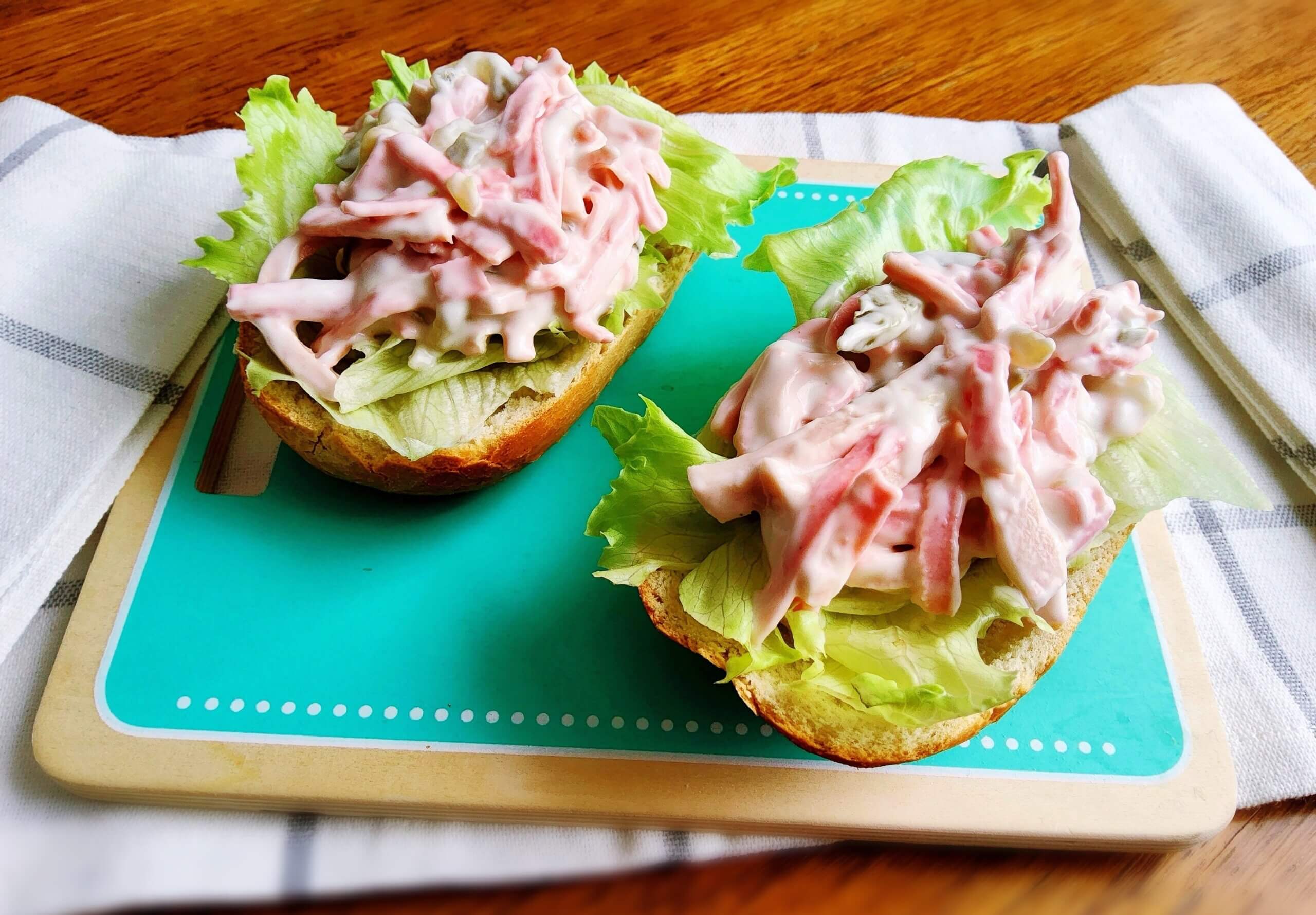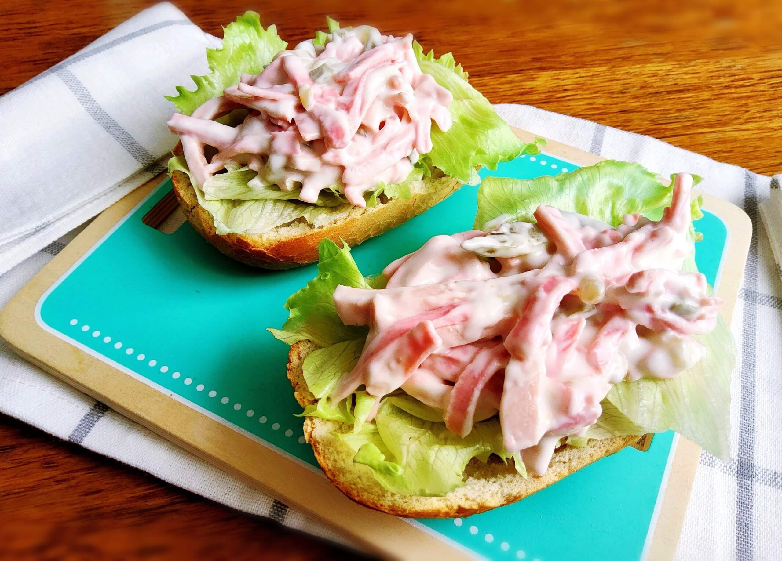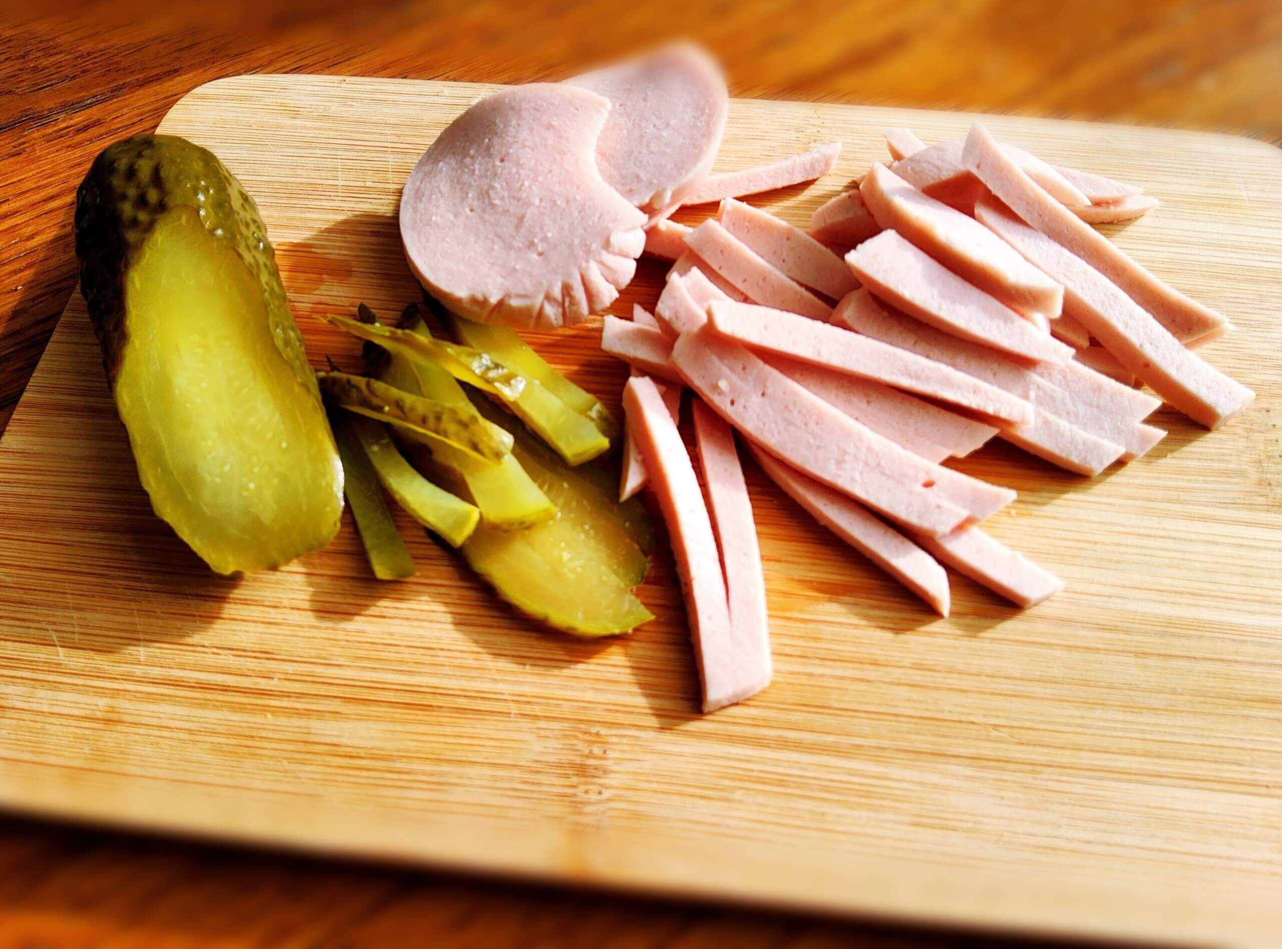- Підготувати інгредієнти: варену ковбасу, мариновані огірки, майонез і білий перець.