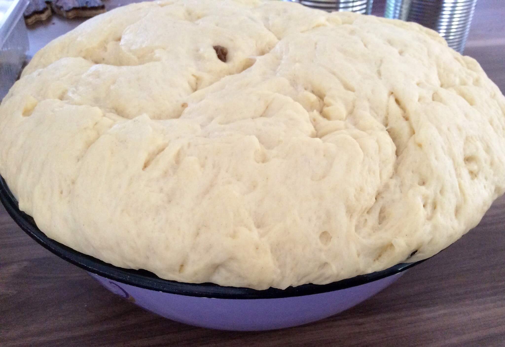 • Жовтки з’єднати з цукром і збити до світлої маси. Додати сіль і перемішати. З’єднати жовткову масу з опарою, перемішати. Поступово, частинами, всипати просіяне борошно. Додати розтоплене вершкове масло частинами та вимішувати до мʼякого, еластичного стану. Наприкінці всипати родзинки до тіста та рівномірно вмішати. Родзинки попередньо розмочити, обсушити і трошки обсипати борошном.
