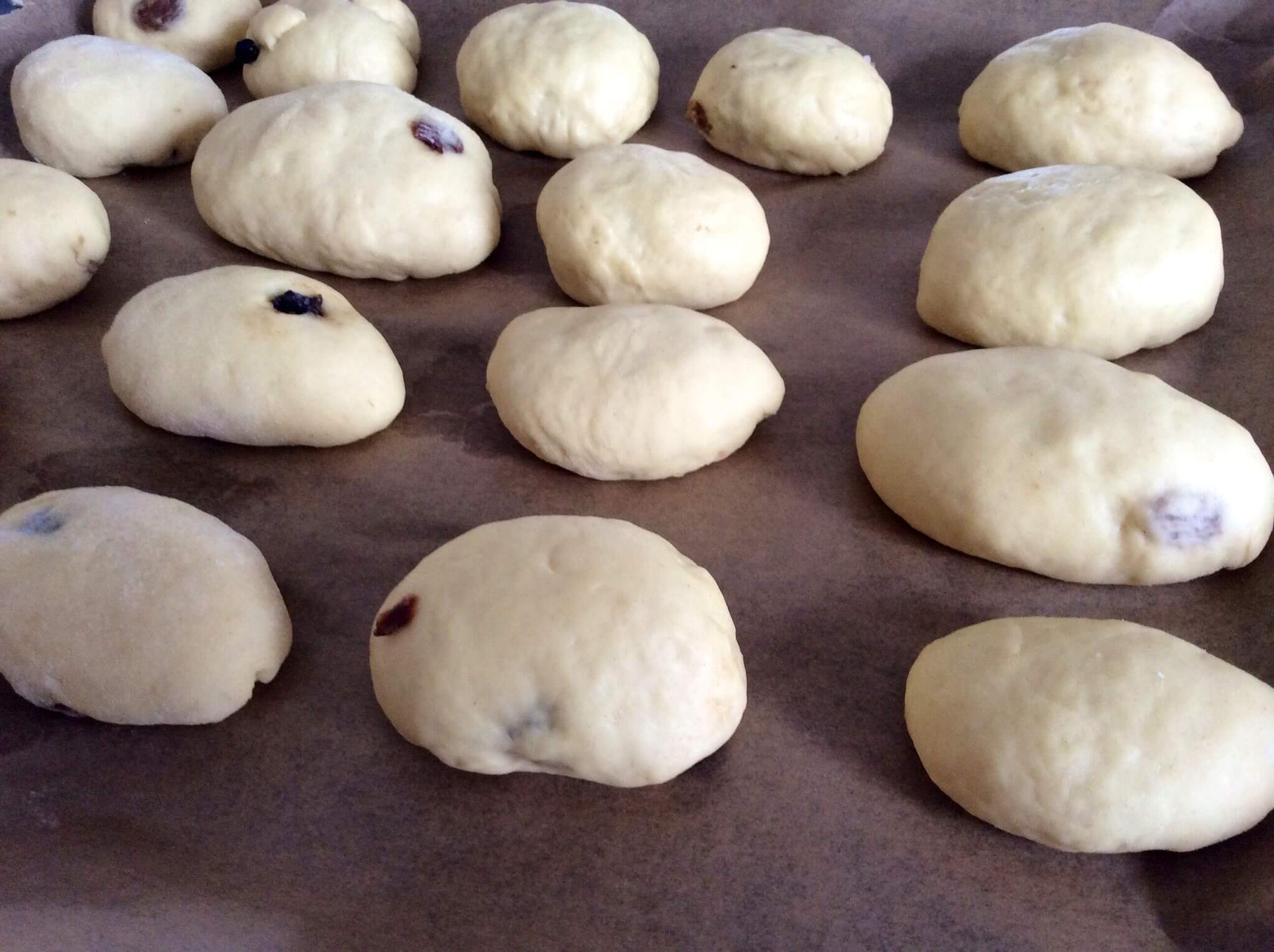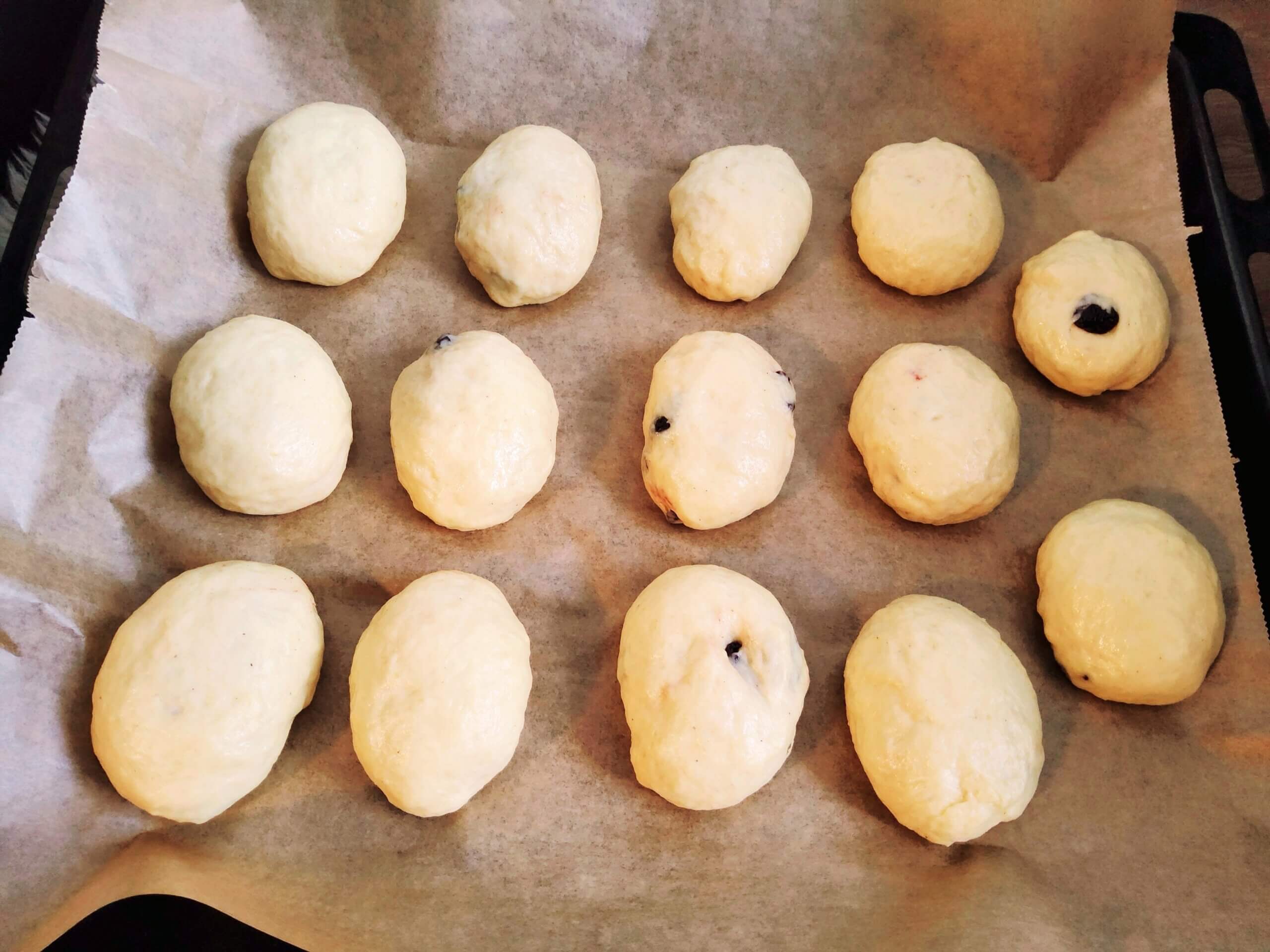 • Викласти пиріжки на деко, застелене пергаментом, швом донизу. Залишити на 30 хвилин для підйому, накривши чистим і сухим рушником.